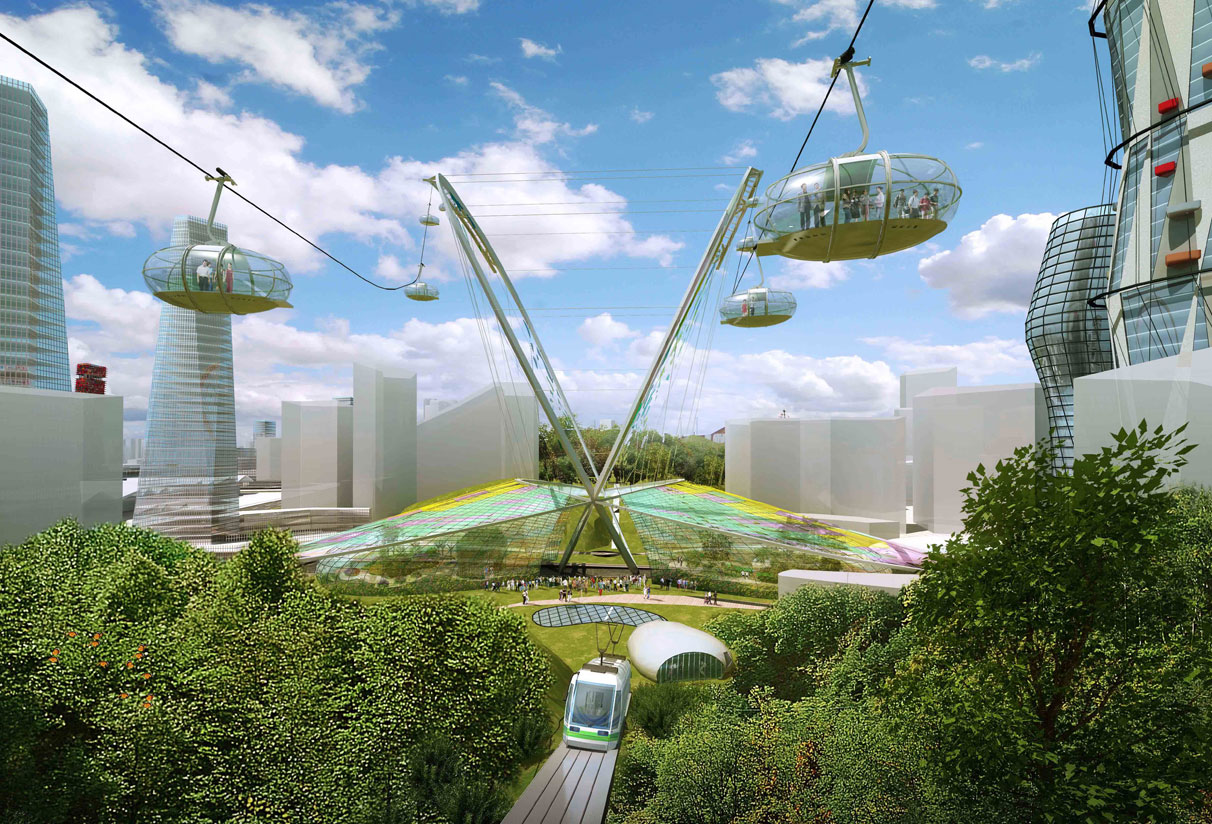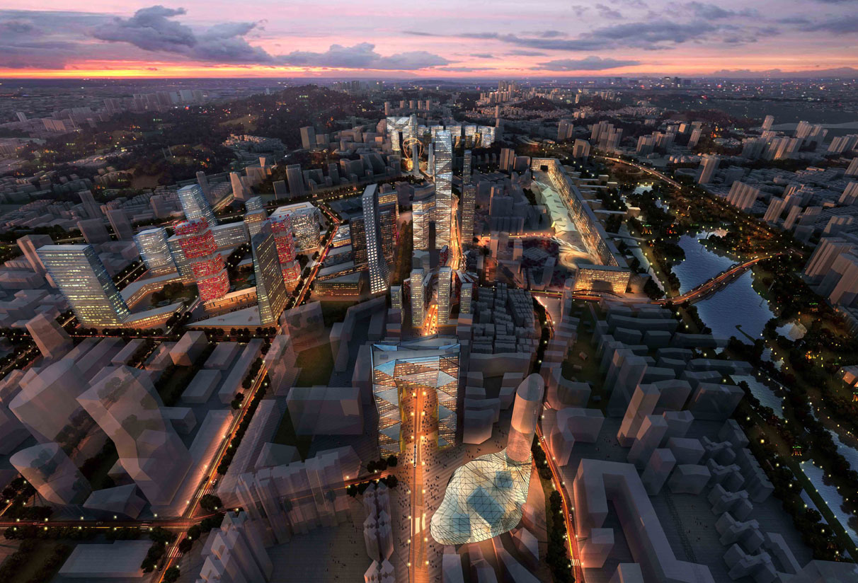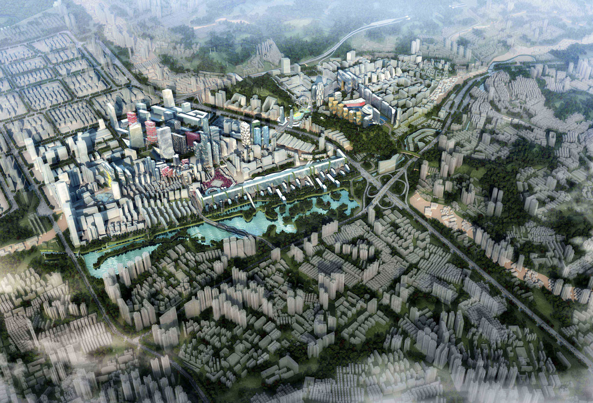 Sungang means ‘Bamboo shoot hill’ and Qingshuihe, ‘Clear river water’. Together with the site’s extraordinary topography, these cues led us to focus on creating large areas of parkland linking existing hills, mountains and lakes with new public realm. As a focus and emblem of regeneration and renewal, we gave the scheme the twin butterflies of Sungang-Qingshuihe, which would act as a catalyst for investment and development by providing a global icon and visitor attraction.